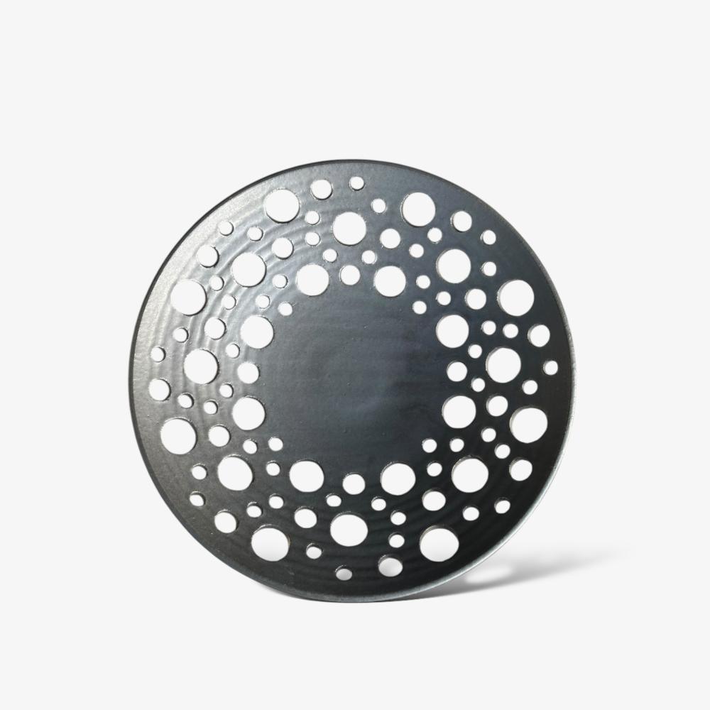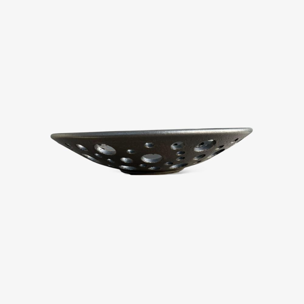 Ett dekorativt fruktfat med hål tillverkat i keramik