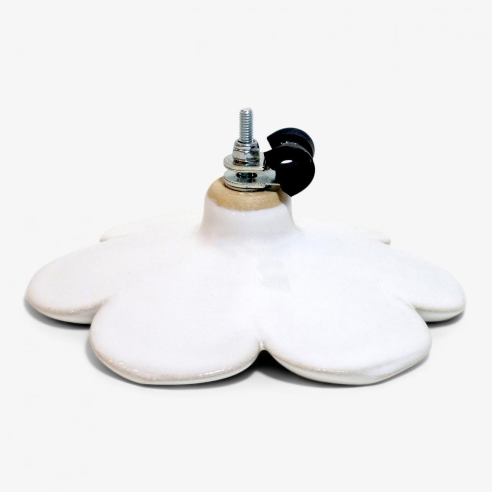 Blomman är handdrejad i stengods, som målats och skurits ut förhand. Blomman är väldigt dekorativ och hängs enkelt upp med det monterade klämfästet. Det flexibla klämfästet gör att möjligheterna för placering blir många och med lite kreativitet kan man enkelt skapa en mängd olika installationer med dessa blommor. Ett tips är att göra en spaljé med ett armeringsnät!